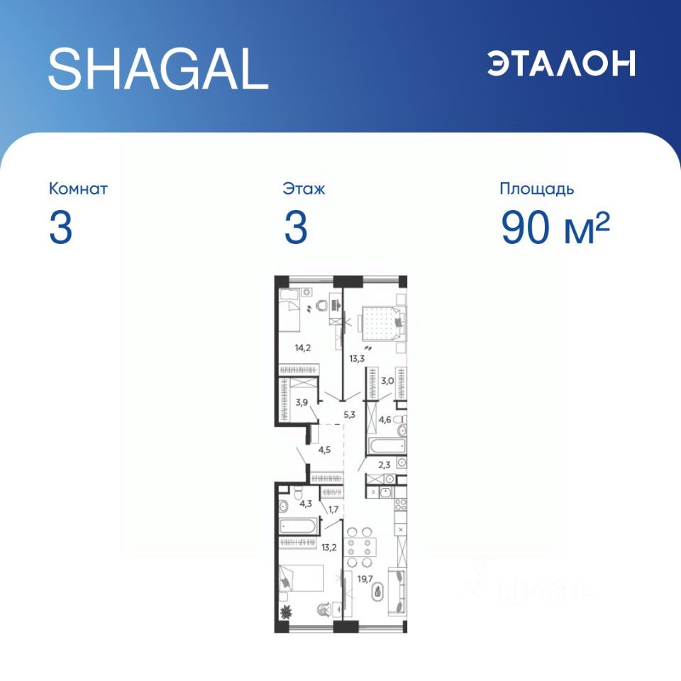 Общая площадь квартиры — 90 кв. м, этаж 3 из 19.