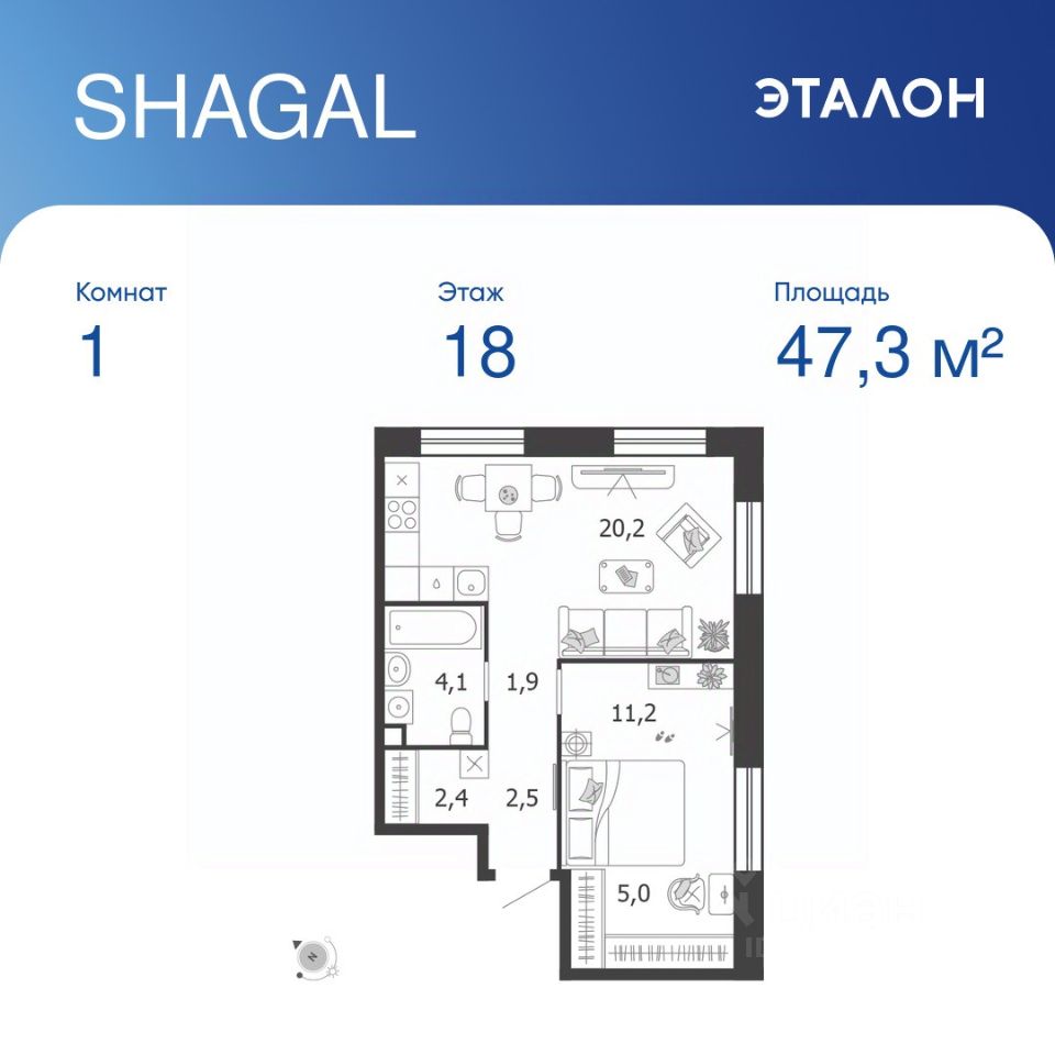 Общая площадь квартиры — 47.3 кв. м, этаж 18 из 18.