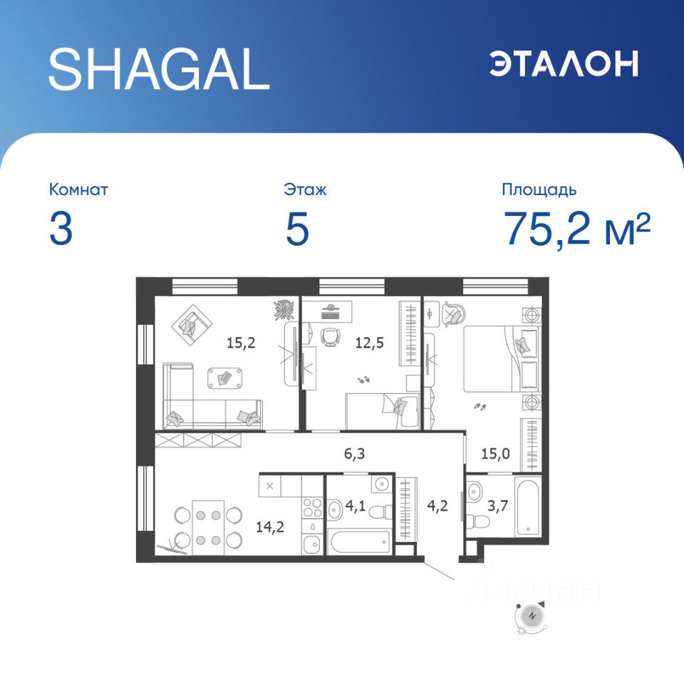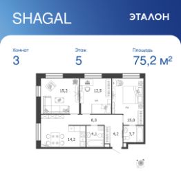 Общая площадь квартиры — 75.2 кв. м, этаж 5 из 18.