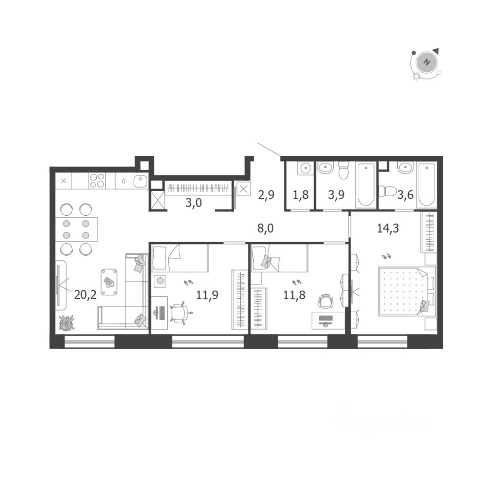 Продается 3-к квартира без отделки в ЖК "Shagal".