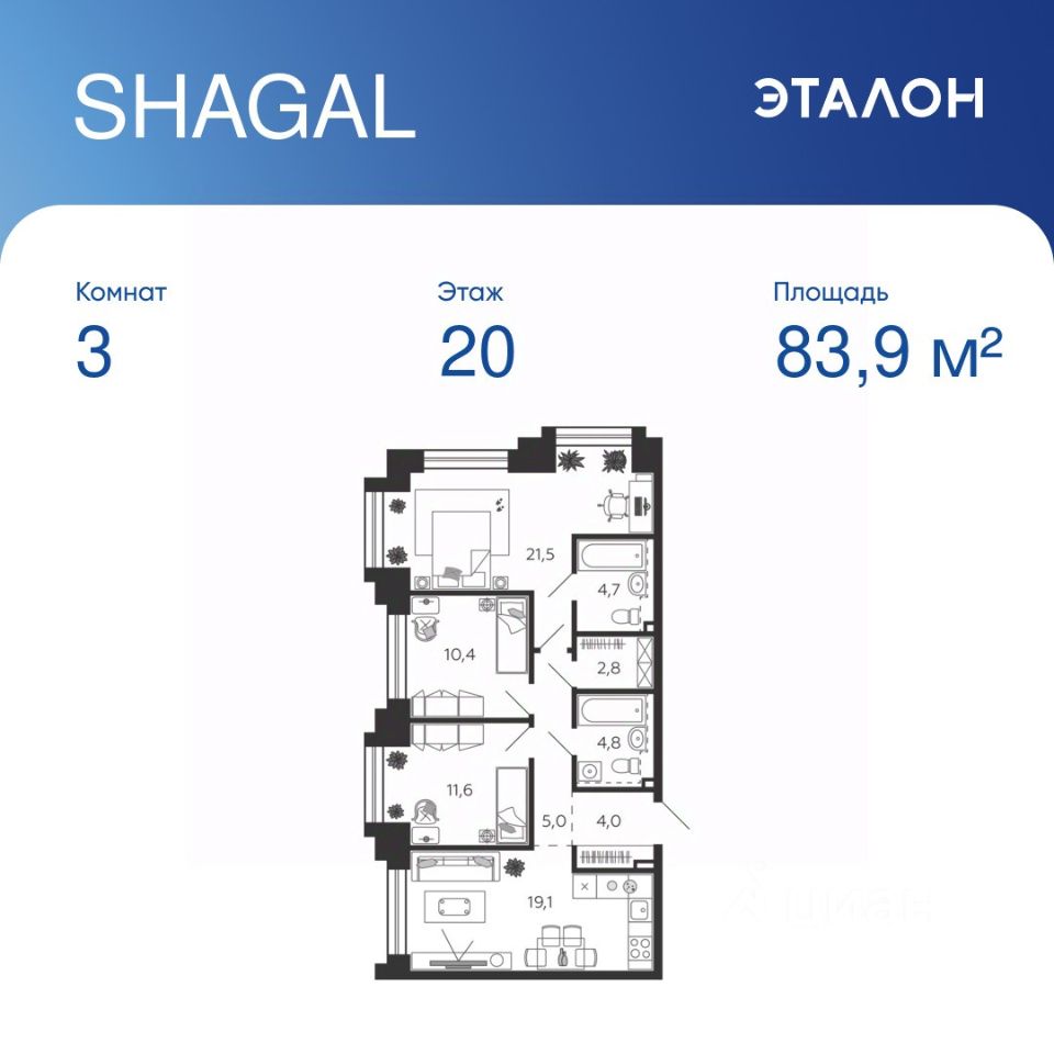 Общая площадь квартиры — 83.9 кв. м, этаж 20 из 27.