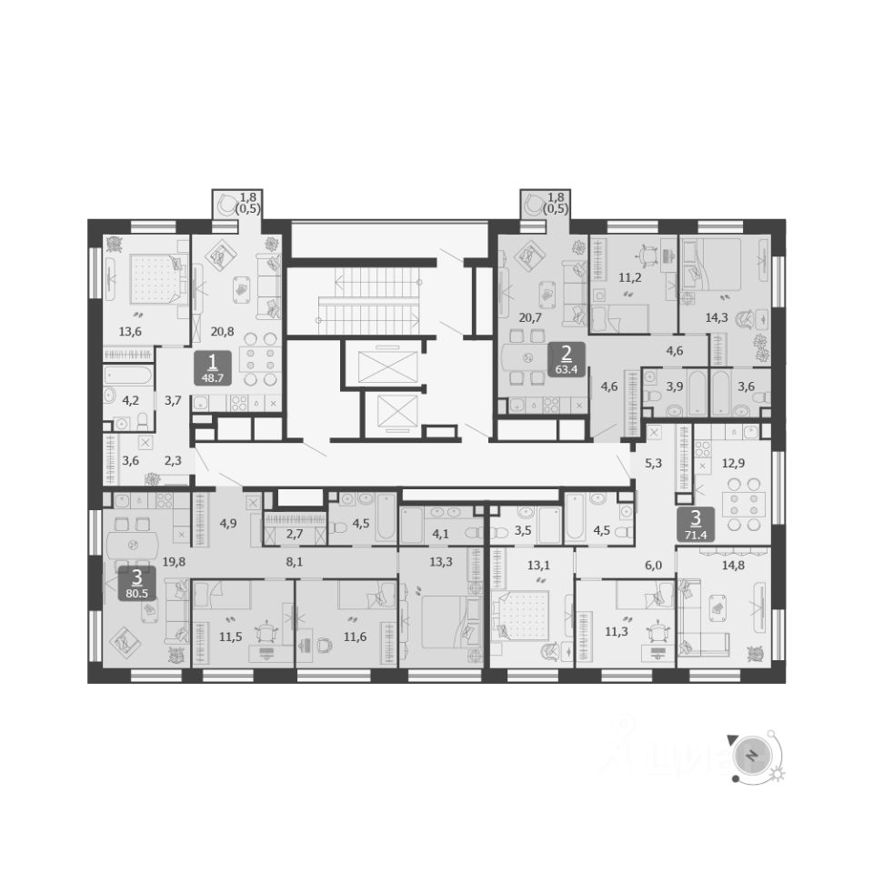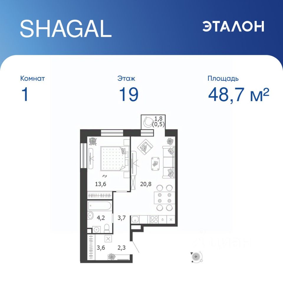 Общая площадь квартиры — 48.7 кв. м, этаж 19 из 19.