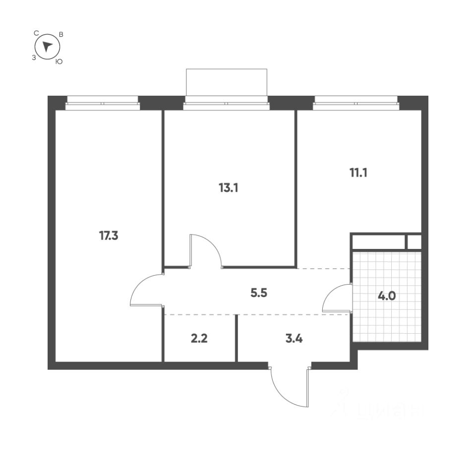 Общая площадь квартиры — 56.6 кв. м, этаж 3 из 4.