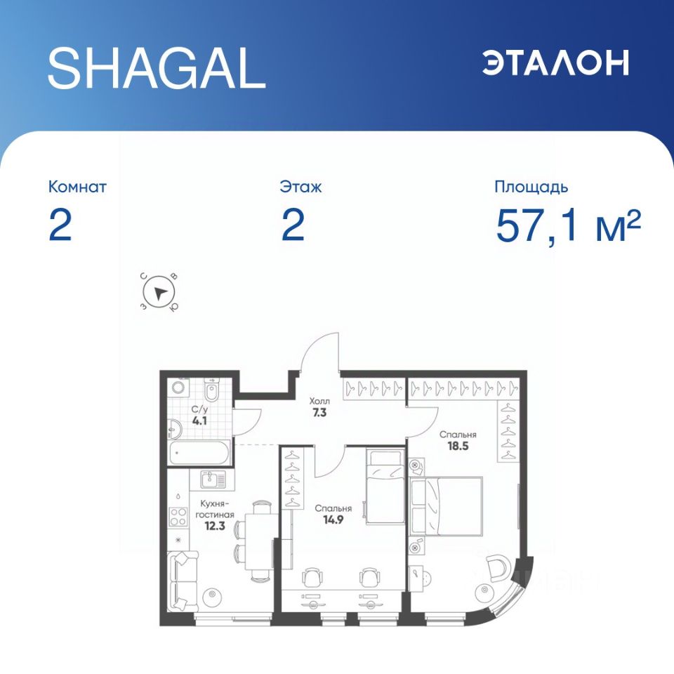 Общая площадь квартиры — 57.1 кв. м, этаж 2 из 26.