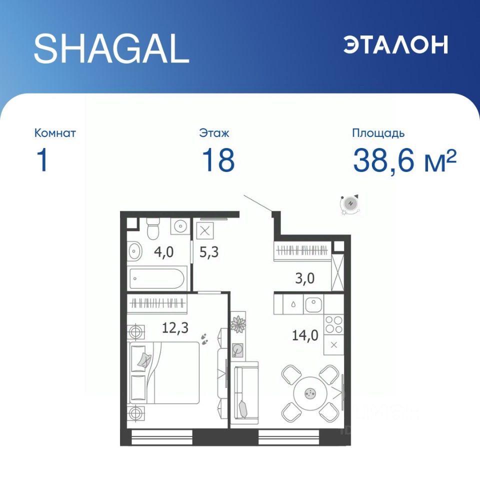 Общая площадь квартиры — 38.6 кв. м, этаж 18 из 18.