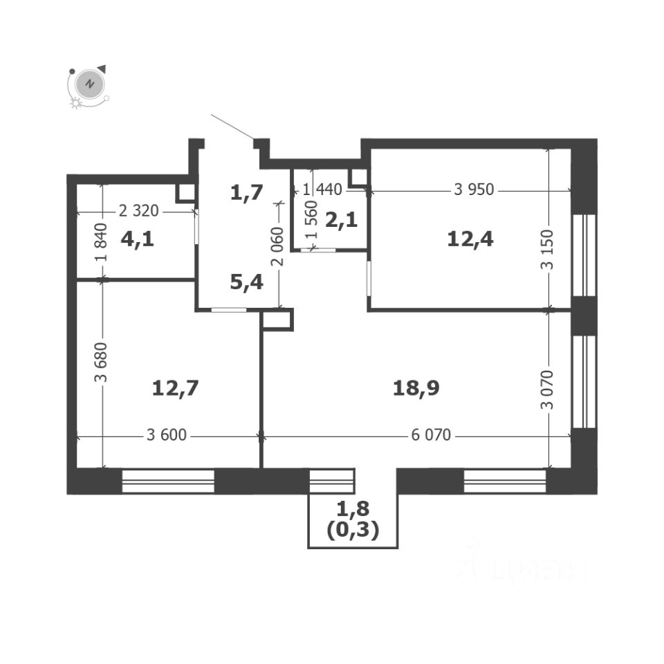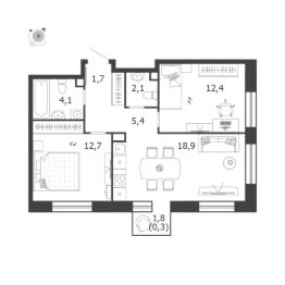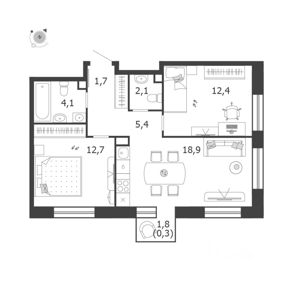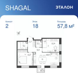 Общая площадь квартиры — 57.8 кв. м, этаж 18 из 18.