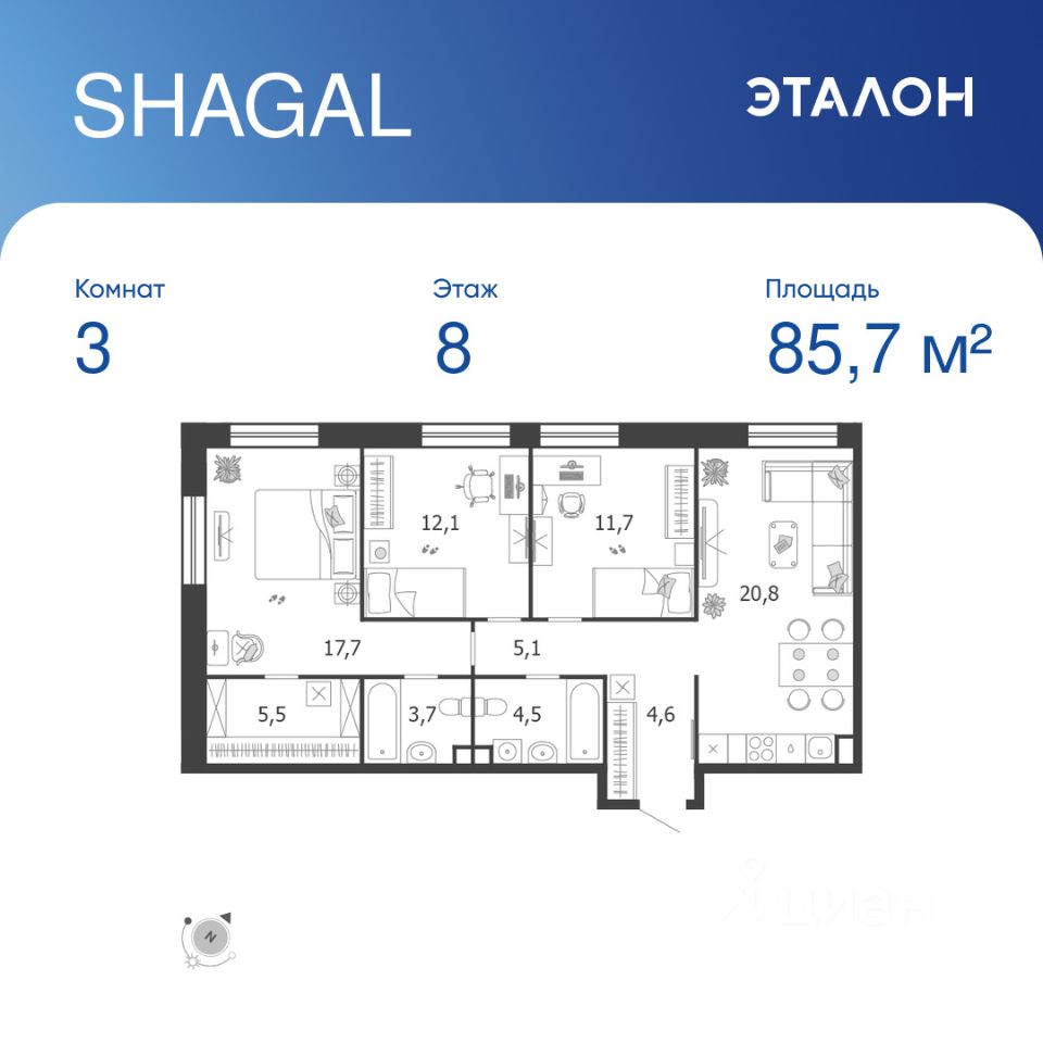 Общая площадь квартиры — 85.7 кв. м, этаж 8 из 18.