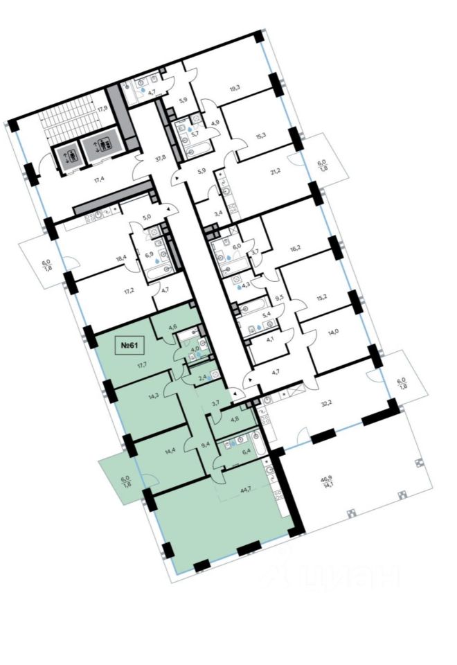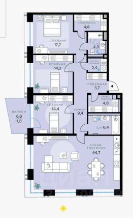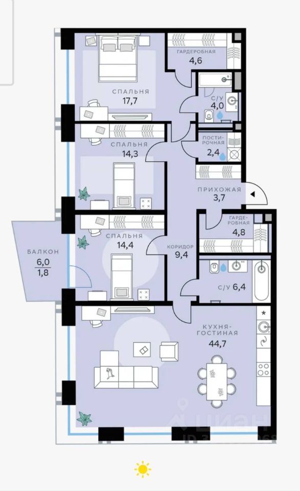 Планировка: кухня- гостиная 44,7 кв.м., мастер спальня 17,7 кв.м., жилая комната 14,3 кв.м., жилая комната 14,4 кв.м., коридор 9,4 кв.м., прихожая 3,7 кв. м., санузел 6,4 кв. м., мастер-санузел 4,0 кв.м., гардеробная 4,8 кв.м., постирочная 2,4 кв.м., балкон 1,8 кв. м. (с коэф. 0,3).