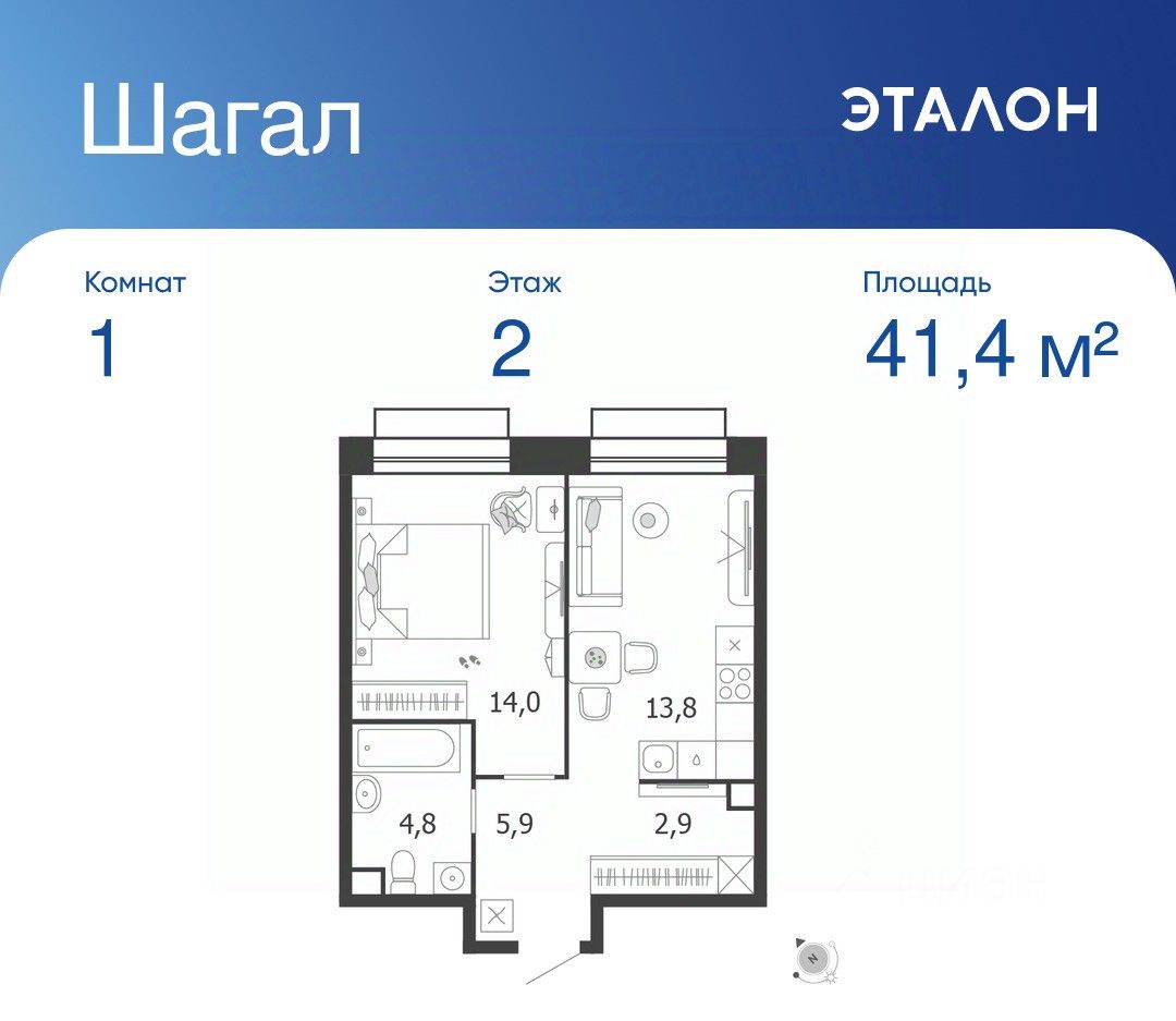 Общая площадь квартиры — 41.4 кв. м, этаж 2 из 3.