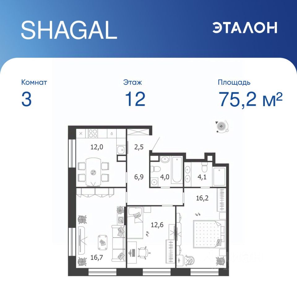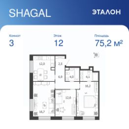 Общая площадь квартиры — 75.2 кв. м, этаж 12 из 19.