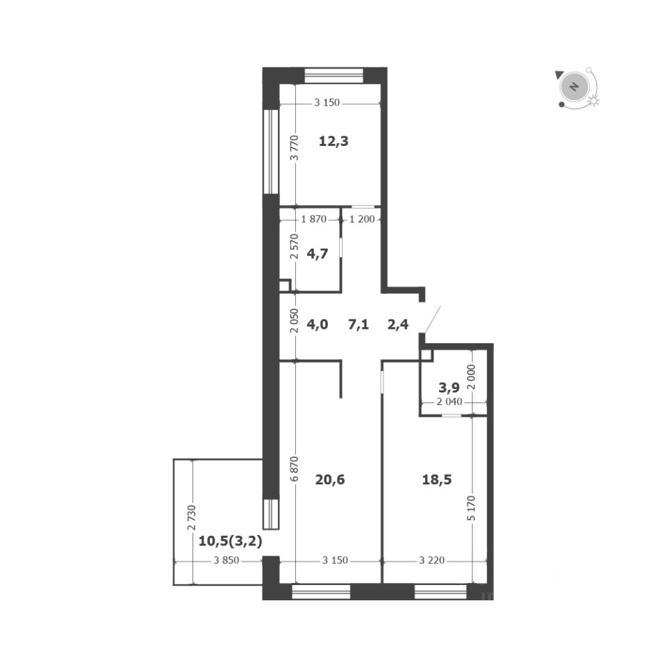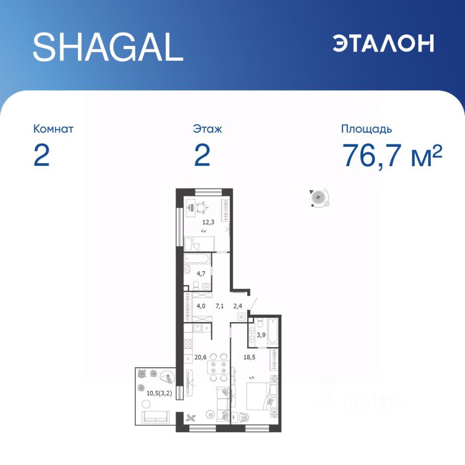 Общая площадь квартиры — 76.7 кв. м, этаж 2 из 19.