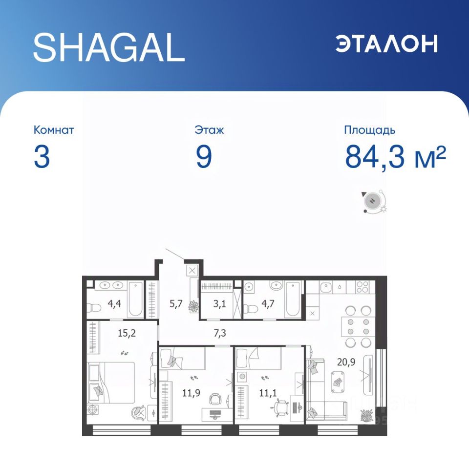 Общая площадь квартиры — 84.3 кв. м, этаж 9 из 19.