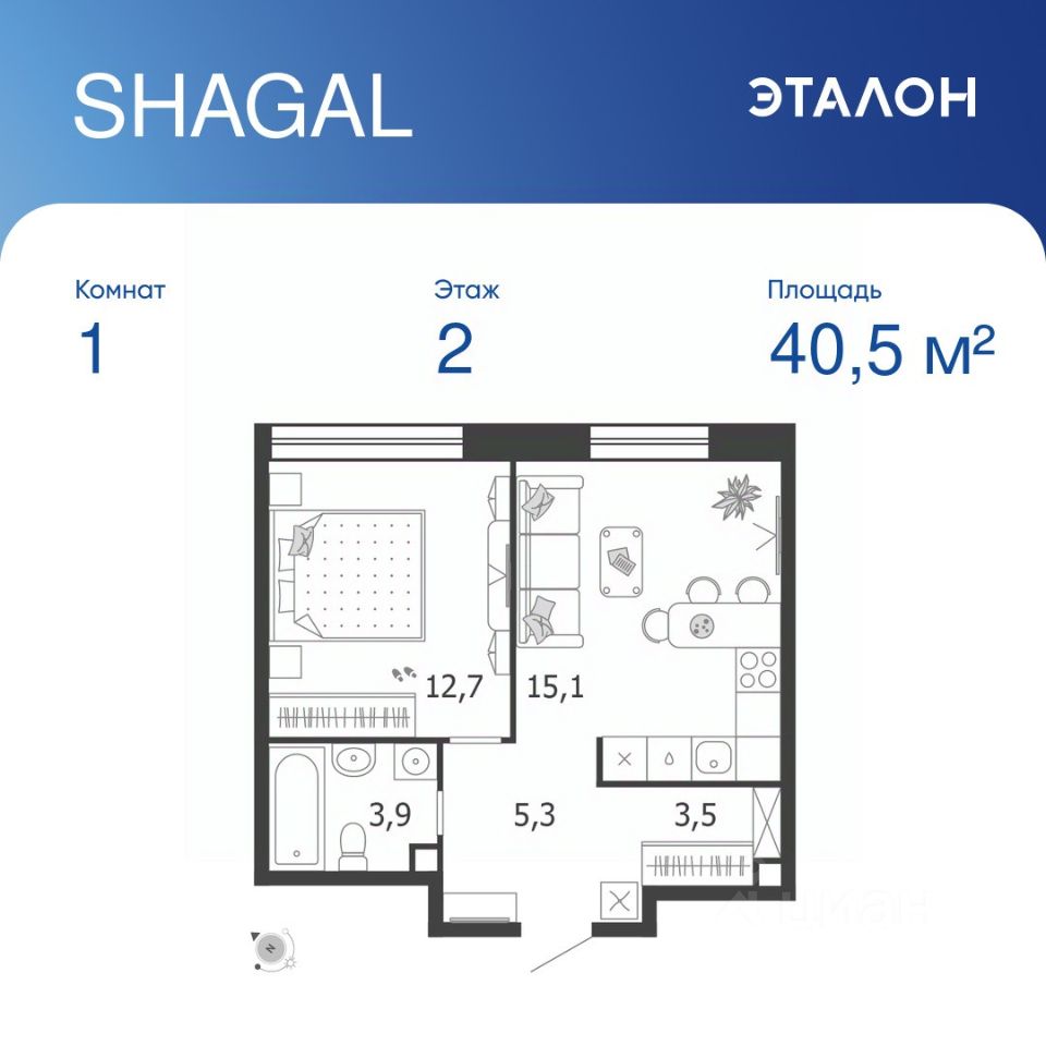 Общая площадь квартиры — 40.5 кв. м, этаж 2 из 18.