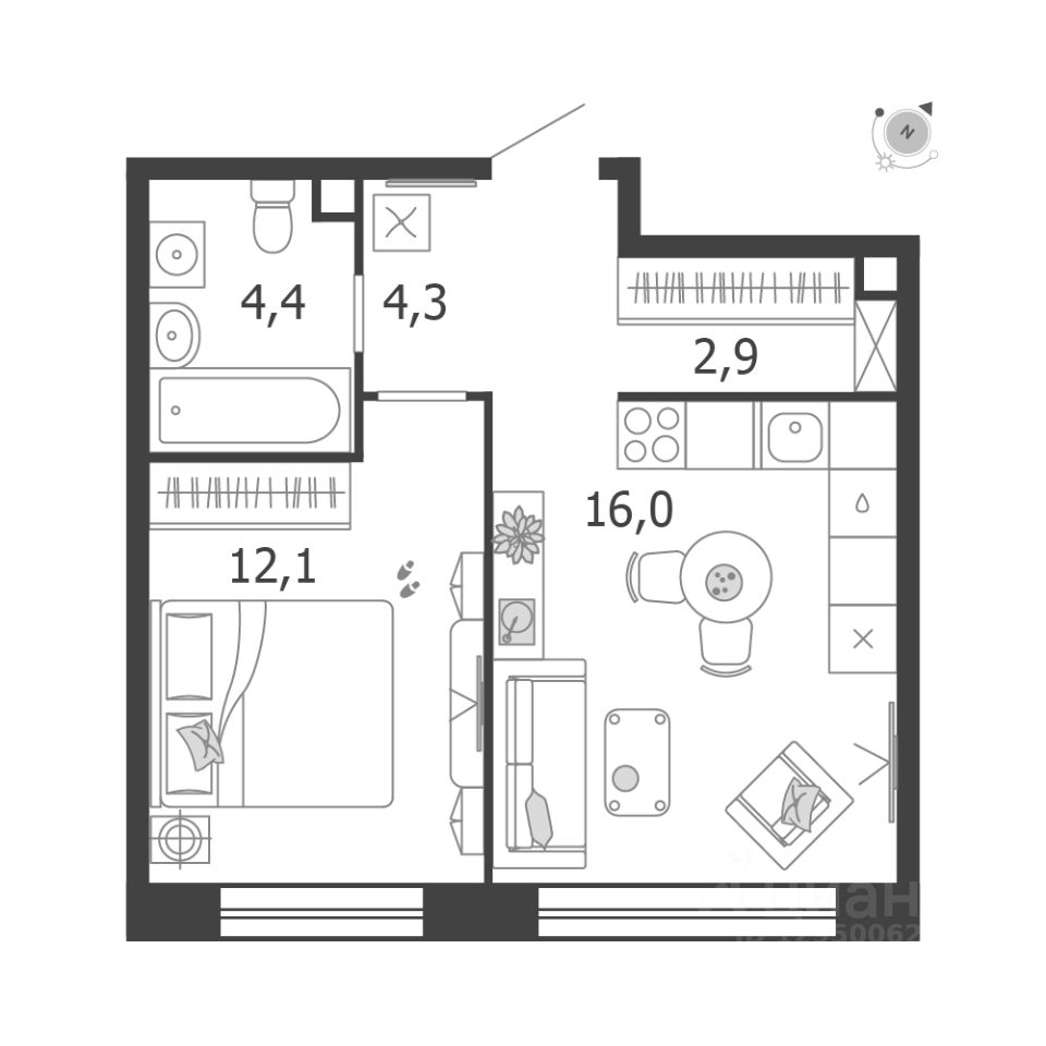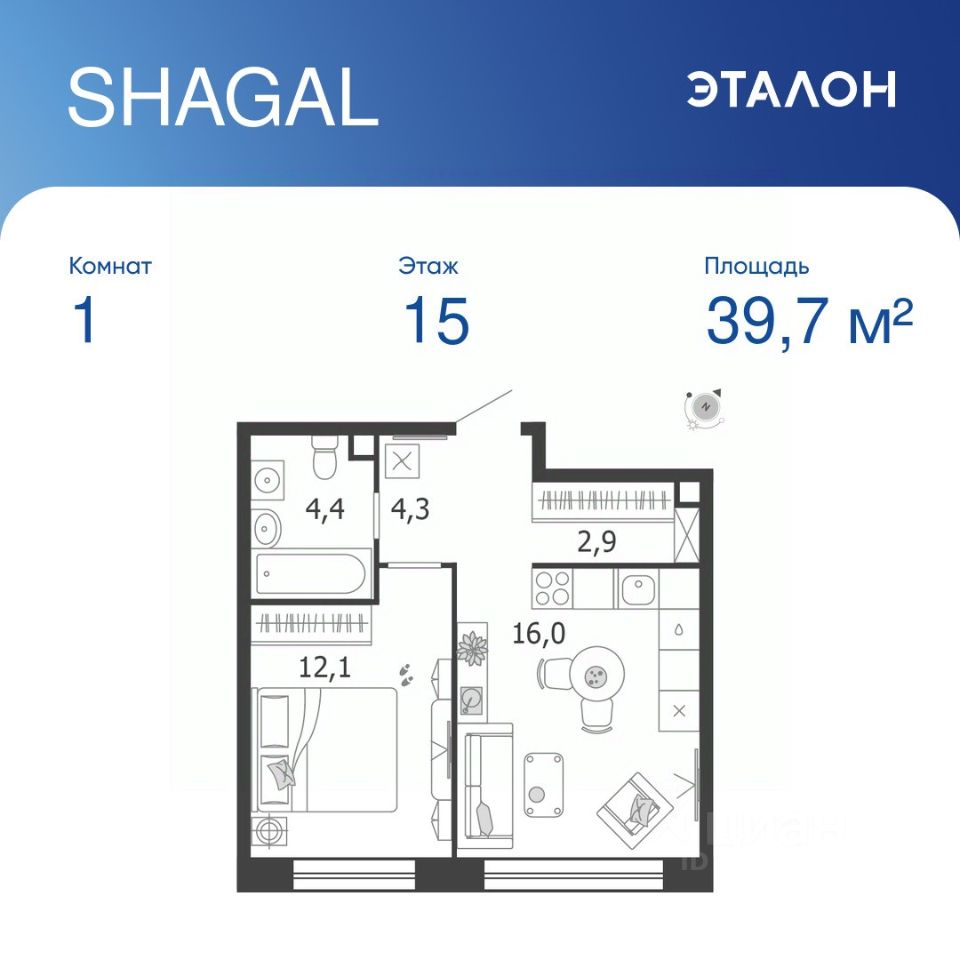 Общая площадь квартиры — 39.7 кв. м, этаж 15 из 18.