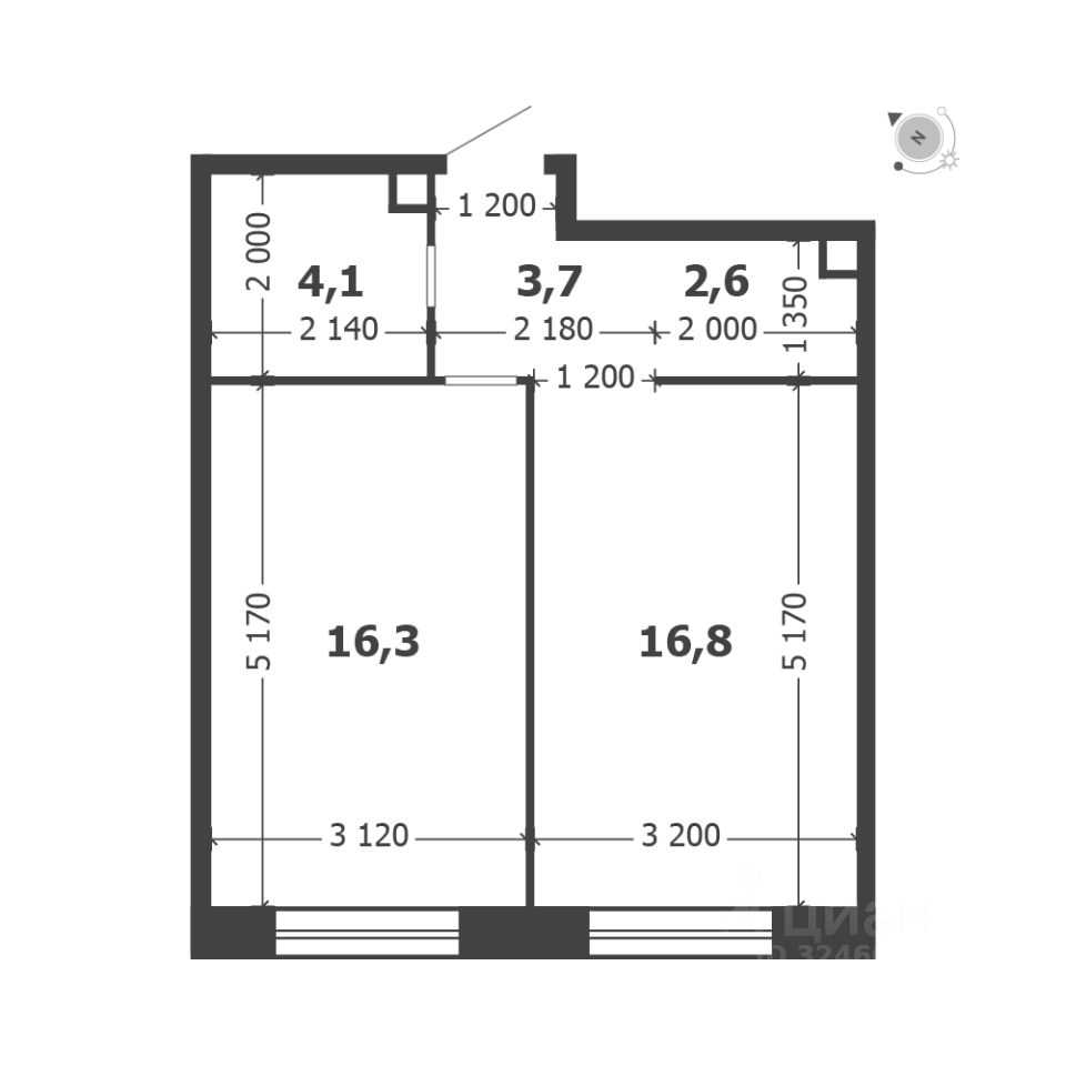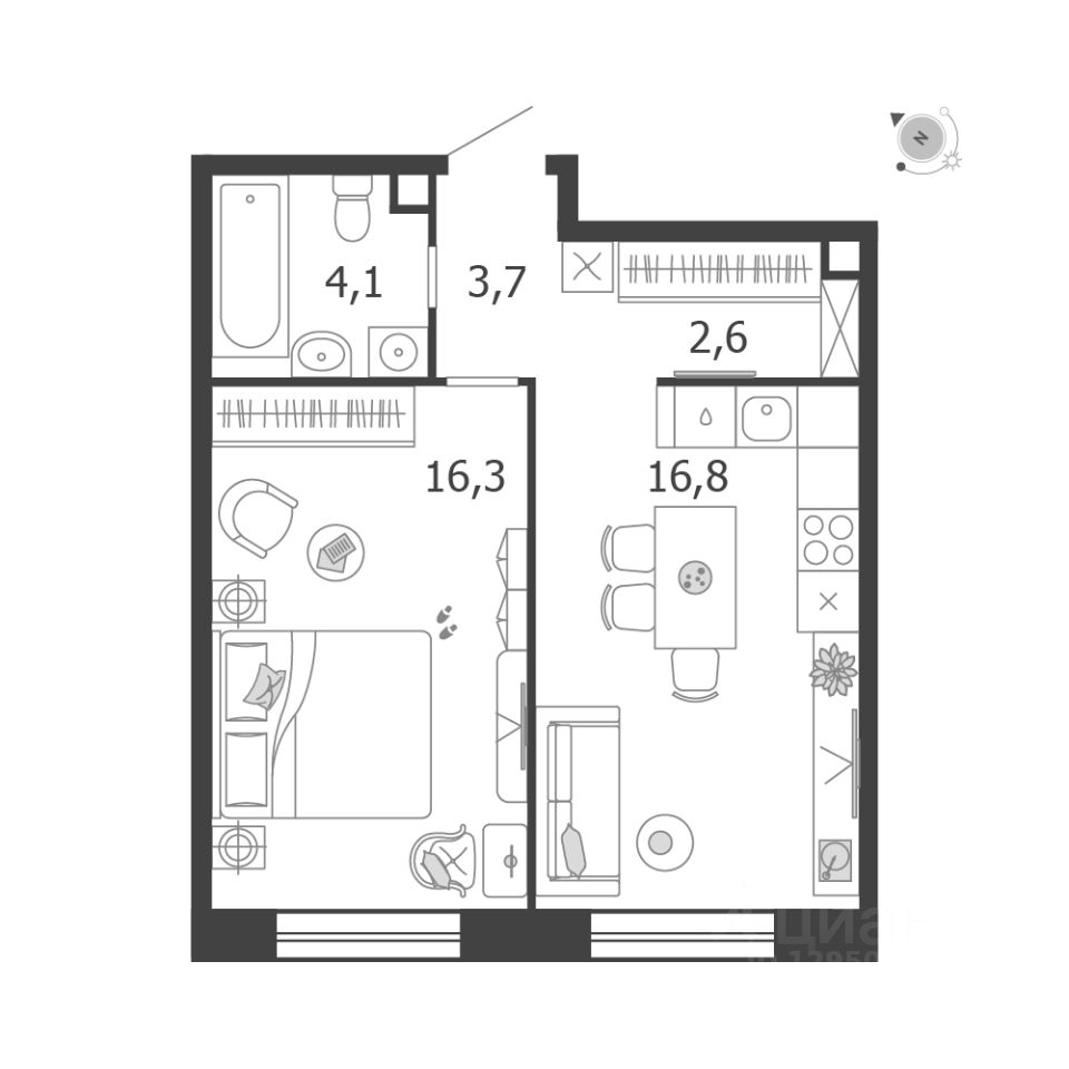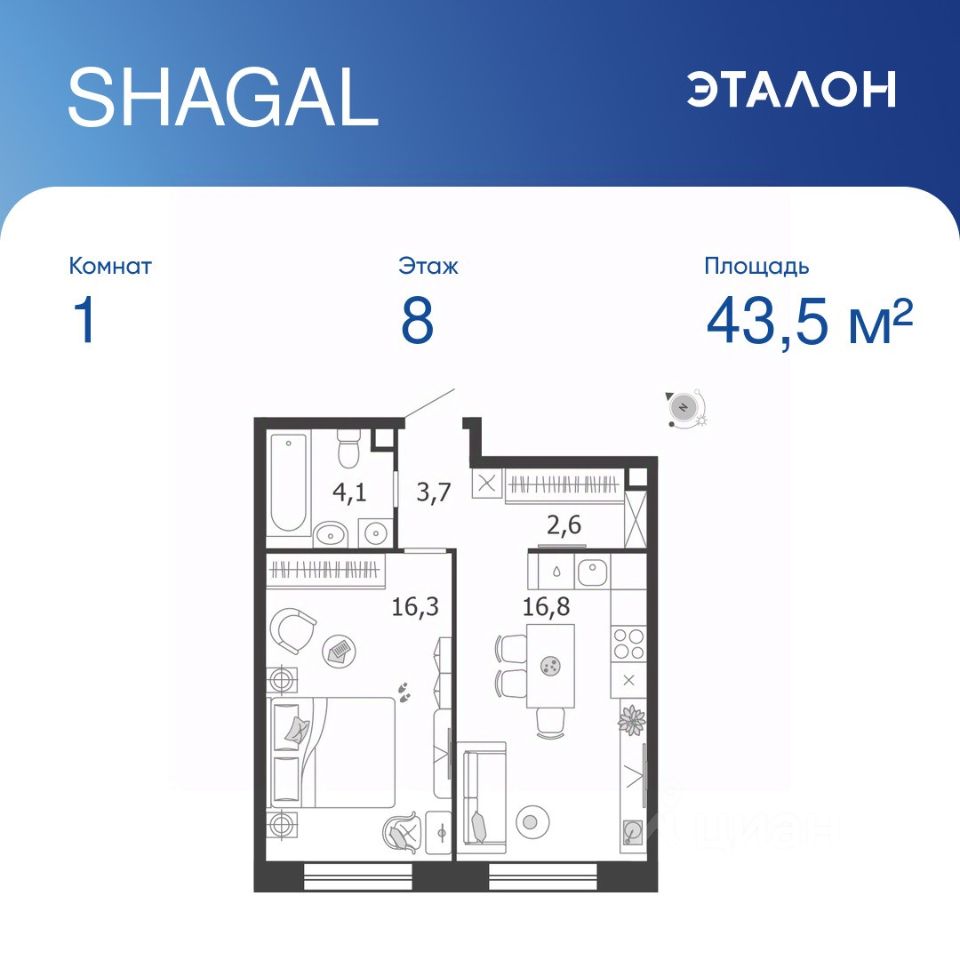 Общая площадь квартиры — 43.5 кв. м, этаж 8 из 18.