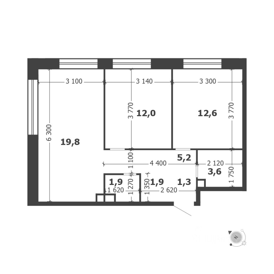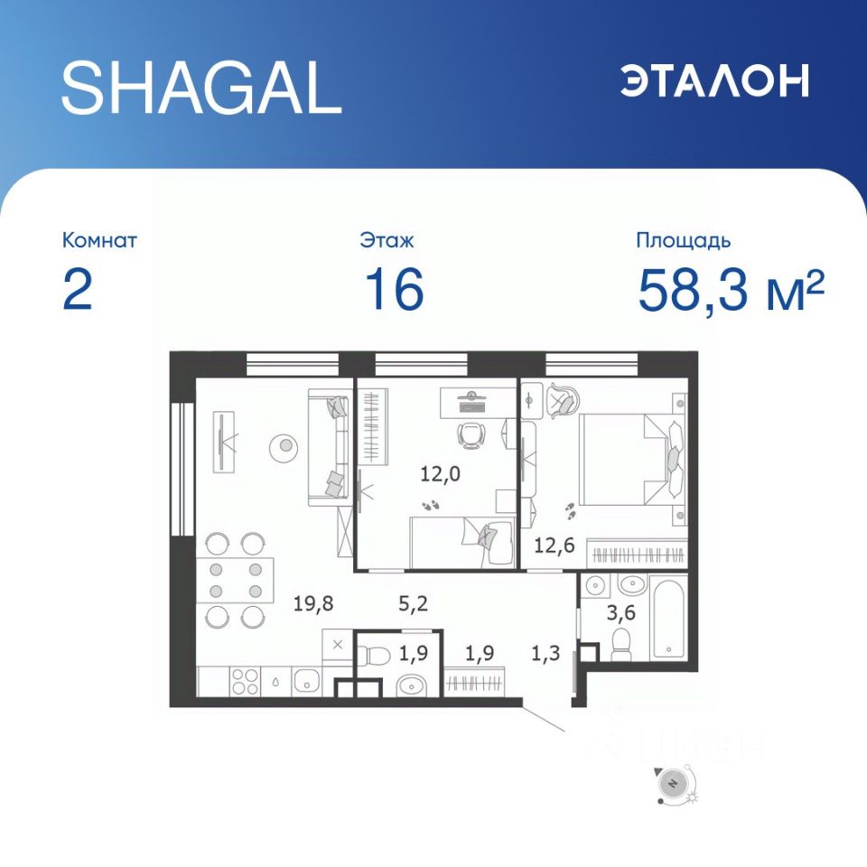 Общая площадь квартиры — 58.3 кв. м, этаж 16 из 18.
