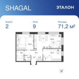 Общая площадь квартиры — 71.2 кв. м, этаж 9 из 18.