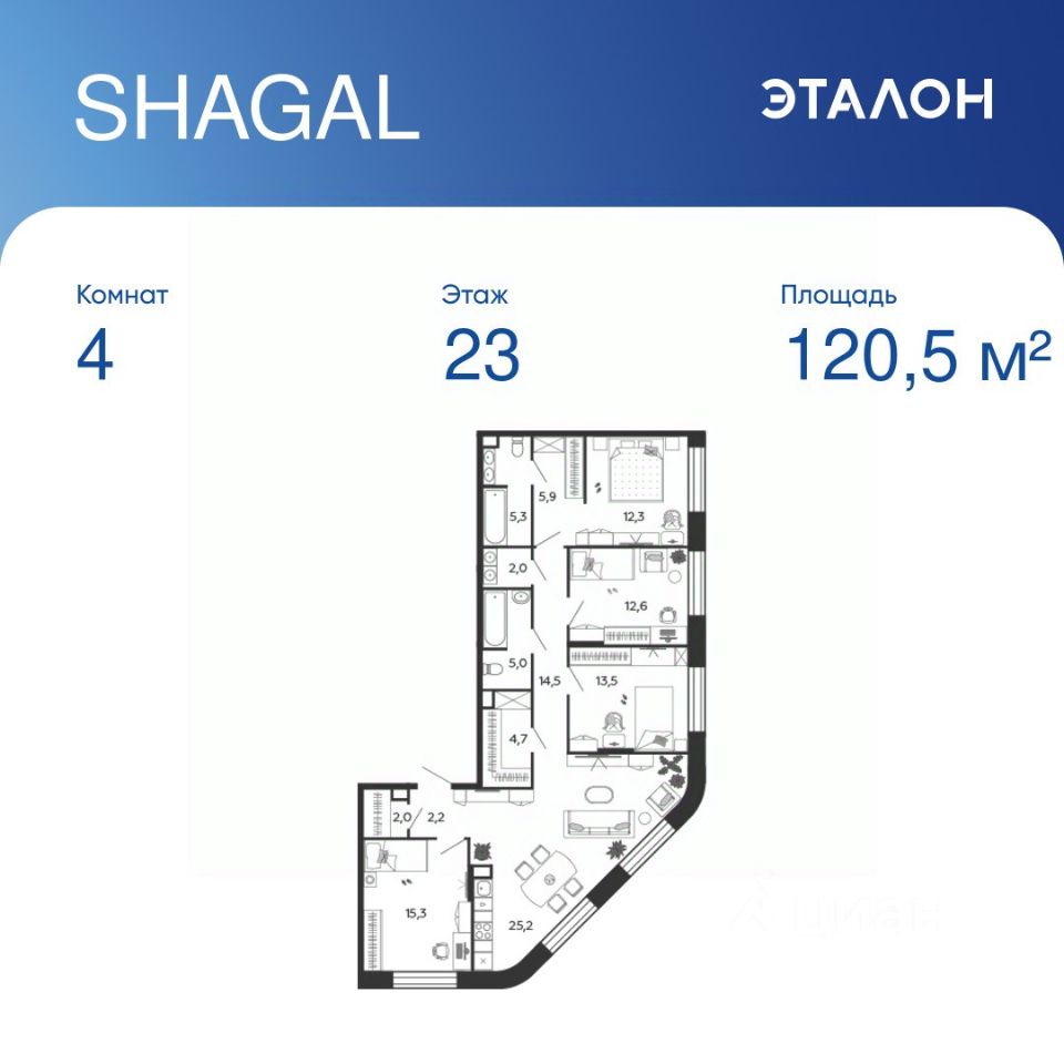 Общая площадь квартиры — 120.5 кв. м, этаж 23 из 27.