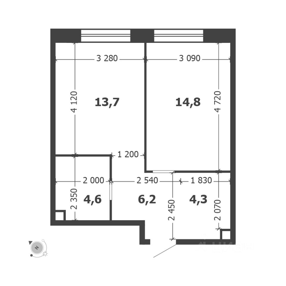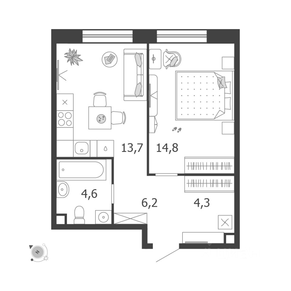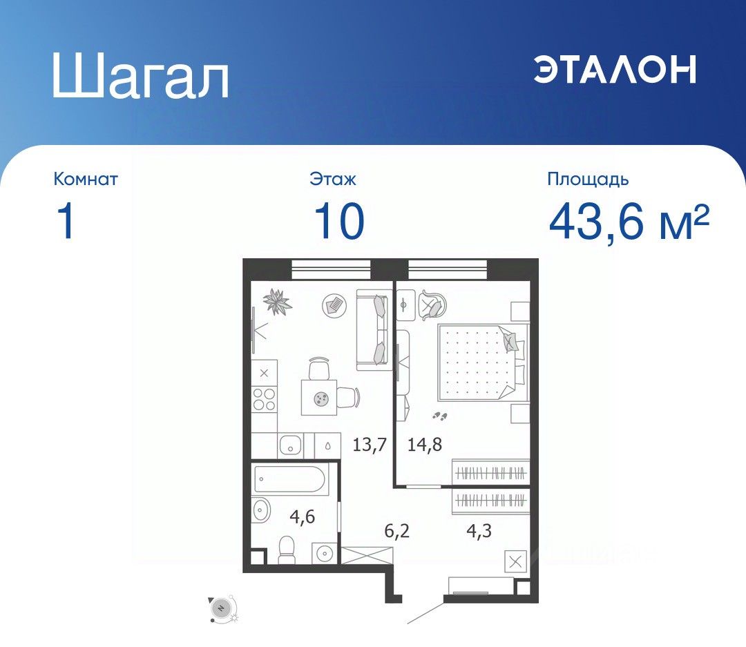 Общая площадь квартиры — 43.6 кв. м, этаж 10 из 18.