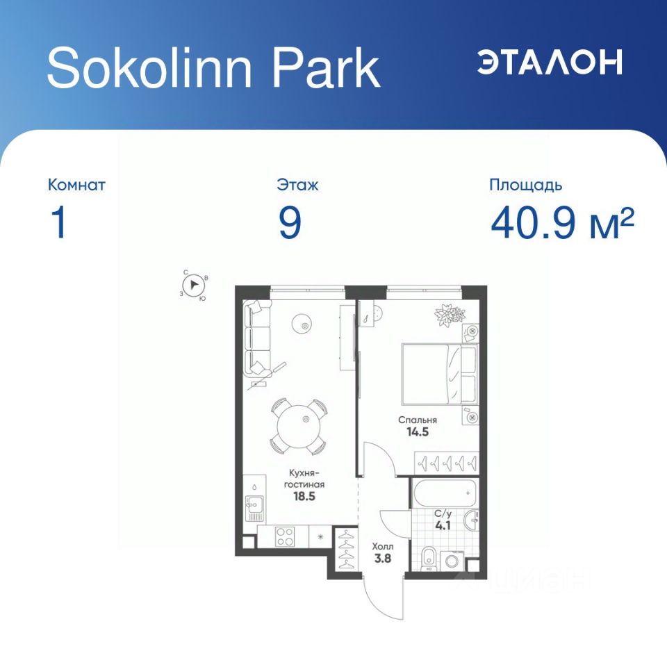 Общая площадь квартиры — 40.9 кв. м, этаж 9 из 21.