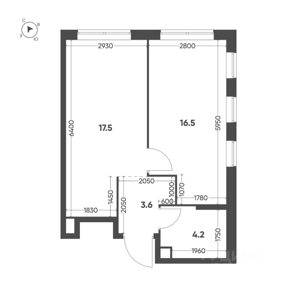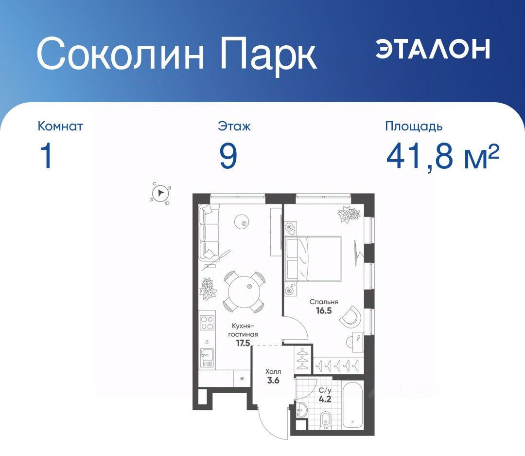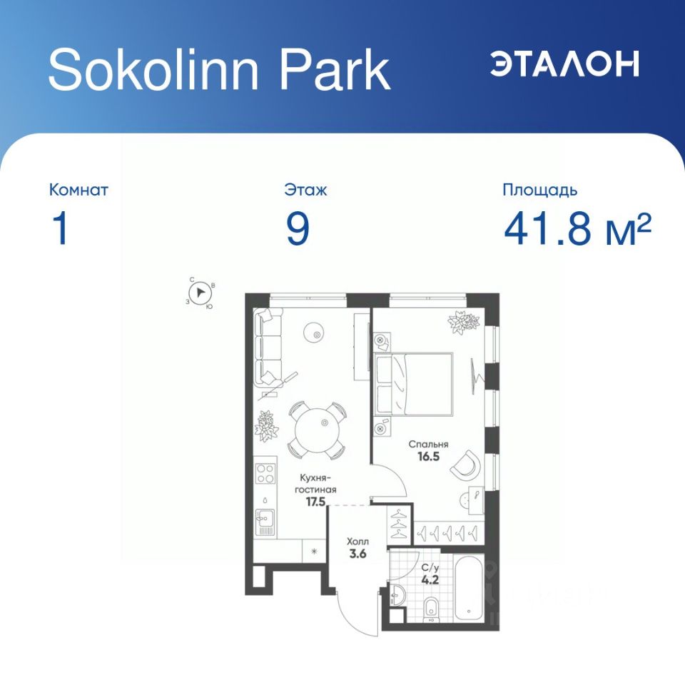 Общая площадь квартиры — 41.8 кв. м, этаж 9 из 21.