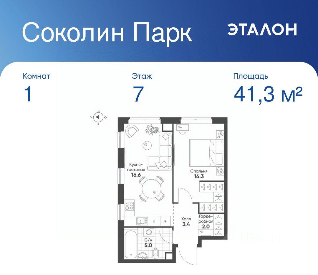 Общая площадь квартиры — 41.3 кв. м, этаж 7 из 21.