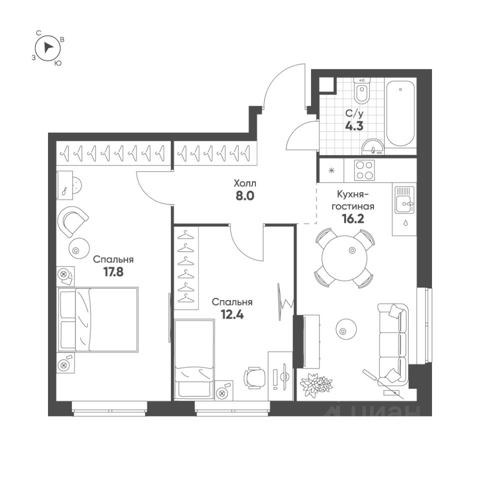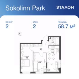 Общая площадь квартиры — 58.7 кв. м, этаж 2 из 21.
