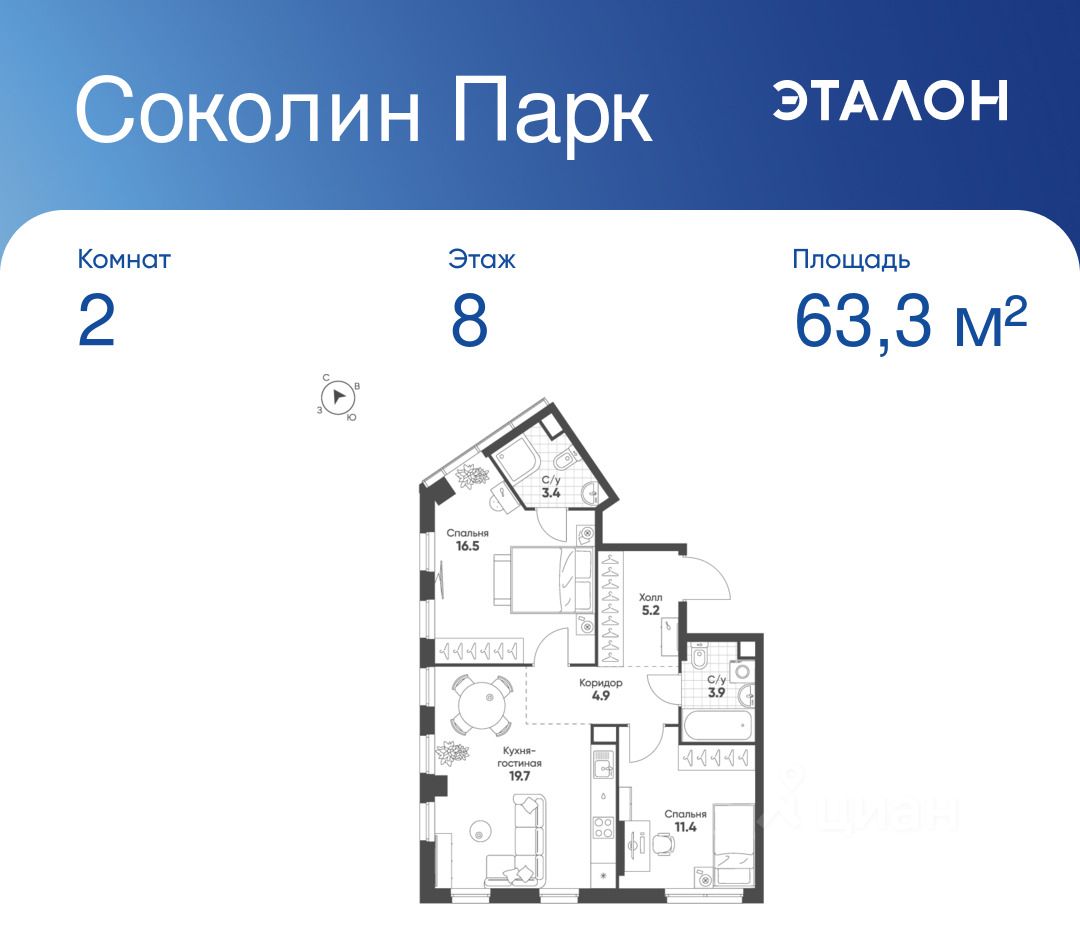 Общая площадь квартиры — 63.3 кв. м, этаж 8 из 21.