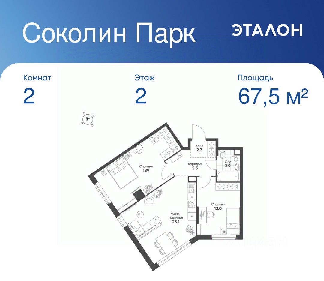 Общая площадь квартиры — 67.5 кв. м, этаж 2 из 21.