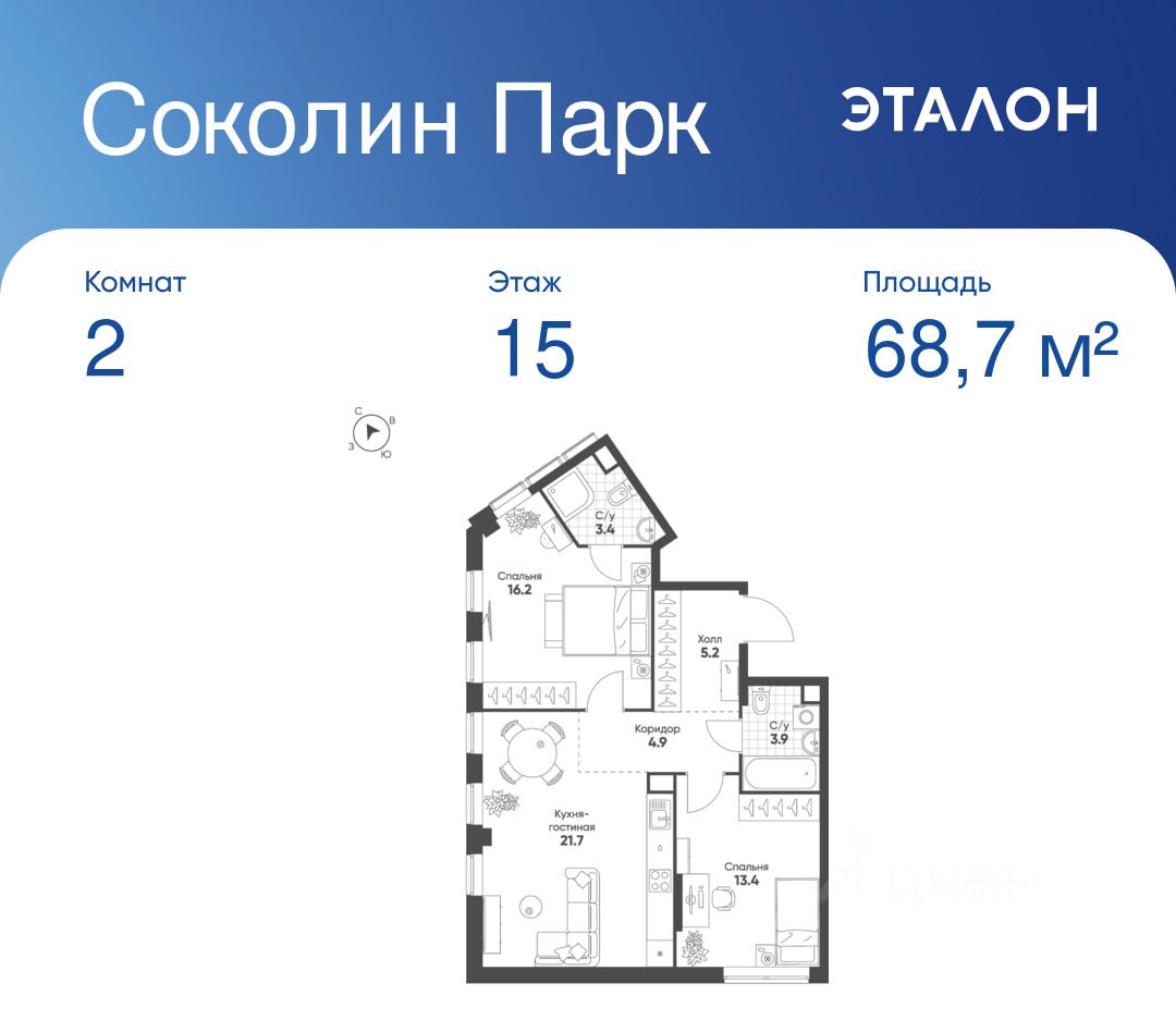 Общая площадь квартиры — 68.7 кв. м, этаж 15 из 21.