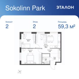 Общая площадь квартиры — 59.3 кв. м, этаж 2 из 12.