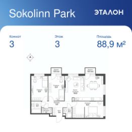 Общая площадь квартиры — 88.9 кв. м, этаж 3 из 12.