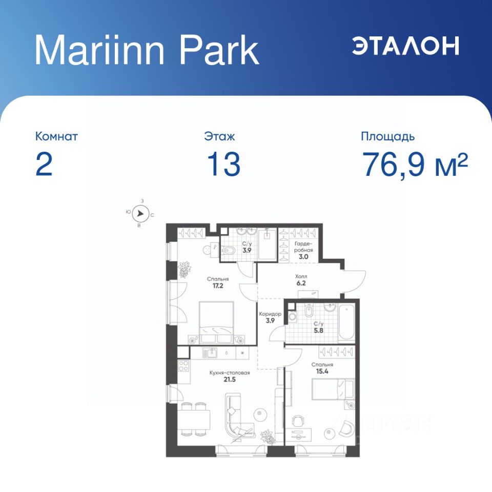 Общая площадь квартиры — 76.9 кв. м, этаж 13 из 16.