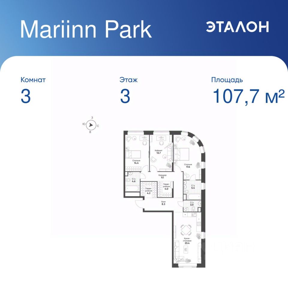 Общая площадь квартиры — 107.7 кв. м, этаж 3 из 16.