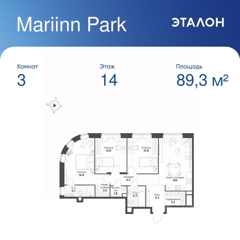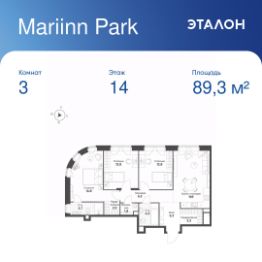 Общая площадь квартиры — 89.3 кв. м, этаж 14 из 16.