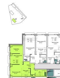 Квартира расположена на 5 этаже 31-этажного монолитного дома. Общая площадь — 49 кв. м, жилая — 21,1 кв. м, площадь кухни — 10 кв. м. Комнаты изолированы, окна выходят на улицу.