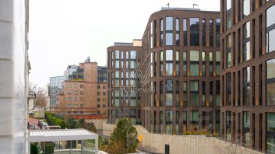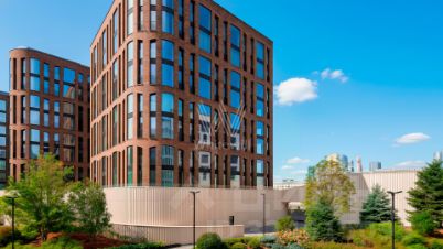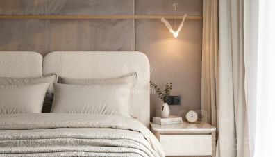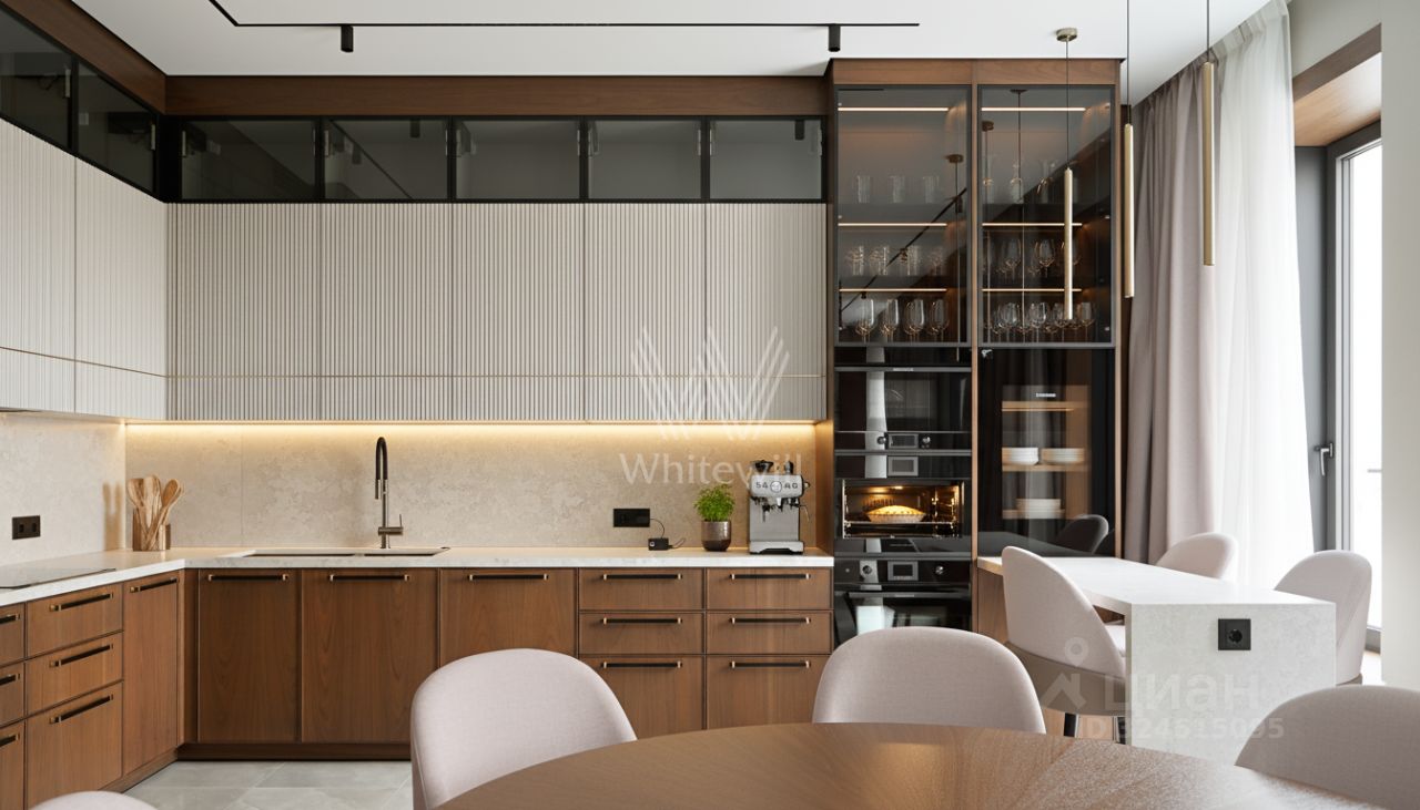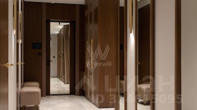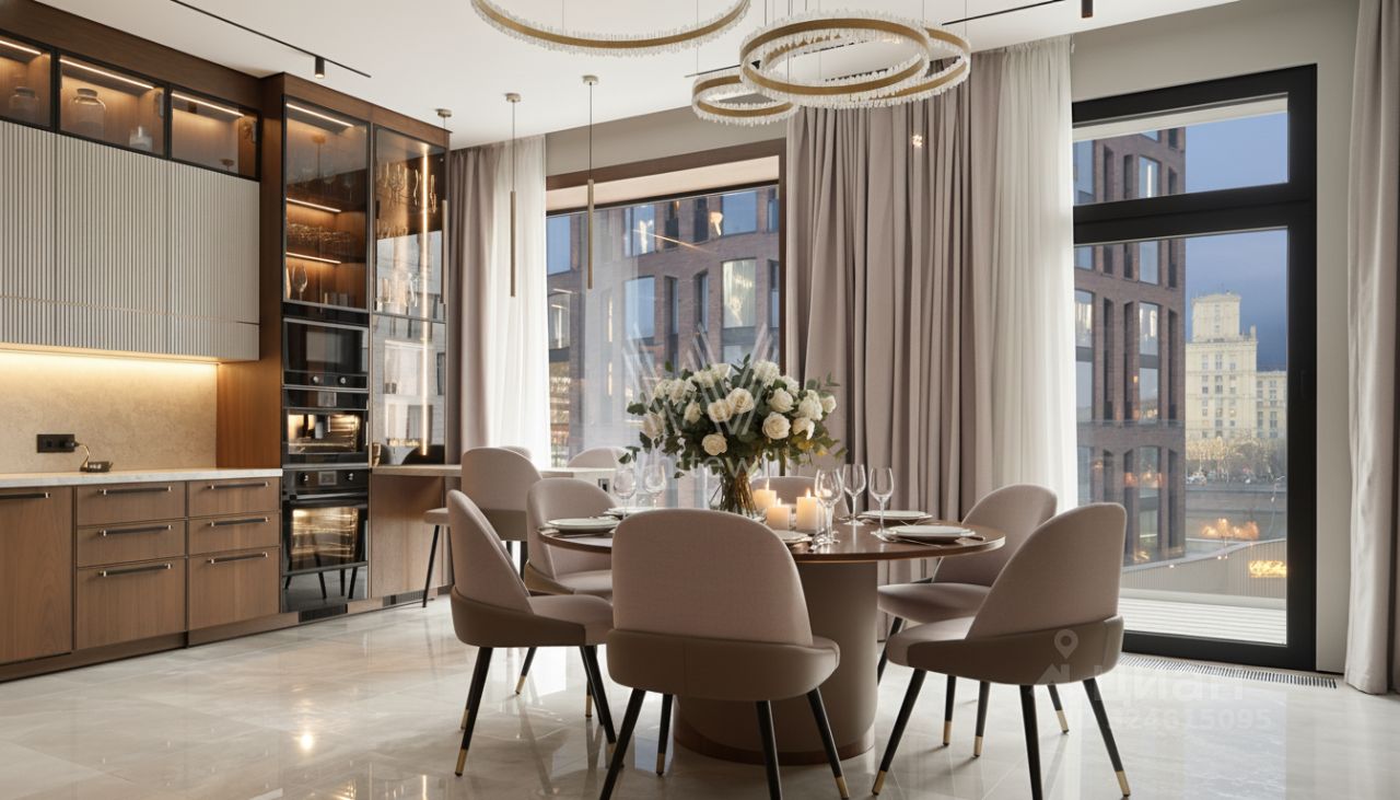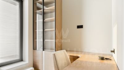 Функциональная планировка включает кухню-гостиную с обеденной зоной и биокамином, мастер-спальню с собственной ванной комнатой и гардеробной, вторую спальню со своим санузлом, гостевую спальню, кабинет, гостевой санузел, гардеробную, прачечную и холл. Панорамные окна ориентированы на две стороны света, открываются виды на Москву-реку и благоустроенную территорию комплекса.
