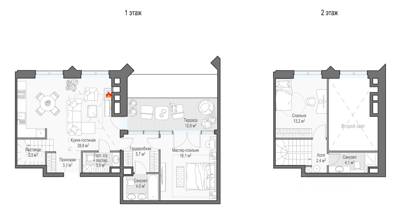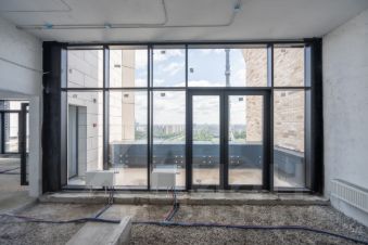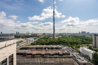 Двухуровневый пентхаус с просторной террасой 12,6 м. Высота потолка - 6,5 м. В кухне-гостиной дровяной камин и два французских балкона. Окна выходят на Восток, открывается впечатляющий вид на зеленый массив парка Дубовая роща и Останкинскую телебашню.