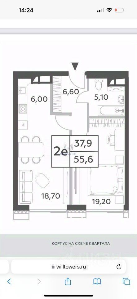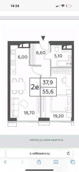 Просторная жилая площадь 55.2 м наполнена естественным светом благодаря большим панорамным окнам, открывающим захватывающий вид на городскую панораму.