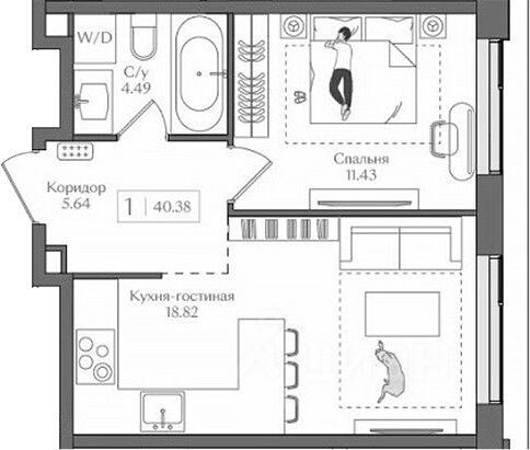 Функциональная планировка: Просторная кухня-гостиная 18.82 м² для совместного времяпровождения и уютная изолированная спальня 11,43 м².