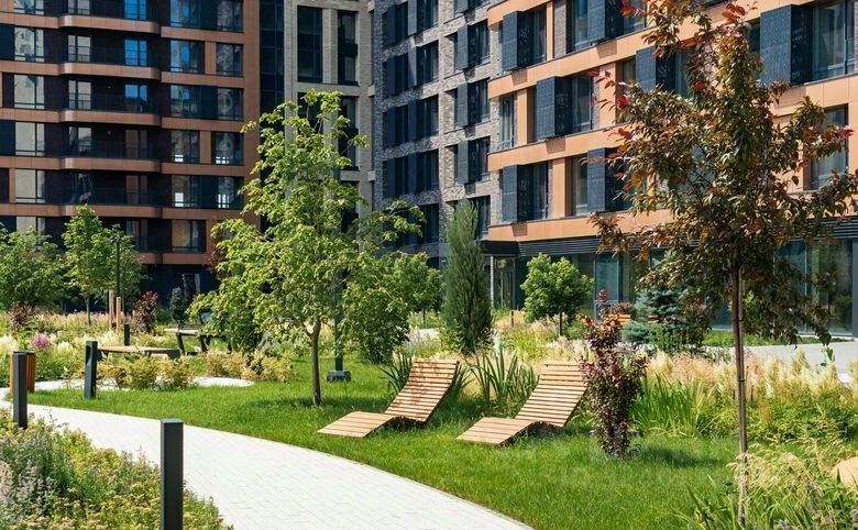 Концепция "двор без машин": Закрытая, охраняемая территория площадью 1,5 га с продуманным ландшафтным дизайном, пешеходным променадом, современными детскими и спортивными площадками.