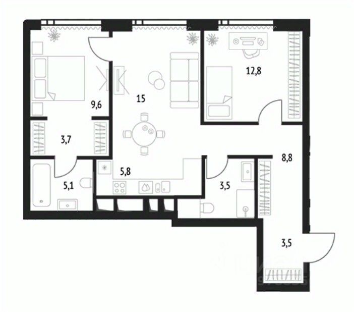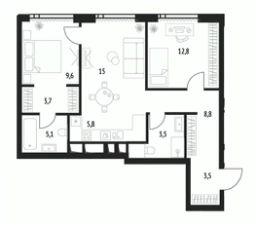 Квартира идеально подходит для семьи с детьми, т.к. имеет две отдельные комнаты (мастер-спальня и детская), просторную кухню-гостиную и два санузла.