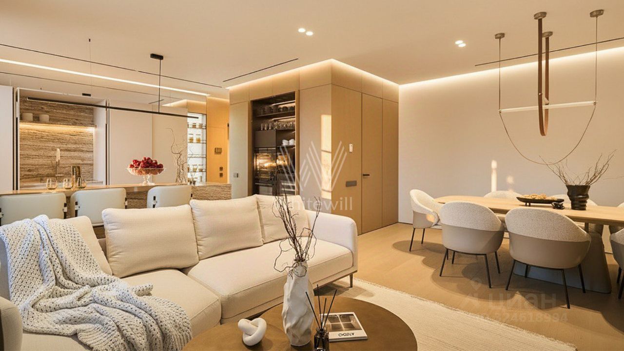 Сантехника и фурнитура из Италии. Шторы с дистанционным управлением с пульта или от "Алисы". Высота потолков 2,84-3,0 метра. Функциональная планировка включает кухню-гостиную с островом и обеденной зоной, мастер-спальню с собственной гардеробной и ванной комнатой, вторую спальню, хозяйственную комнату со шкафом с домашней химчисткой и холл.
