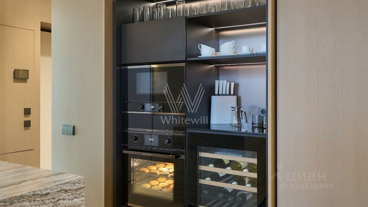 Установлены системы канального кондиционирования, проточной вентиляции с девятиступенчатой фильтрацией, двери скрытого монтажа. На кухне вытяжка ELICA, холодильник Liebherr с электрической системой открывания Servo-Drive от компании Blum. Техника Kuppersbusch: подогреватель для посуды, духовка, микроволновка, винный шкаф. Постирочная техника Miele, немецкой сборки 2025 года.