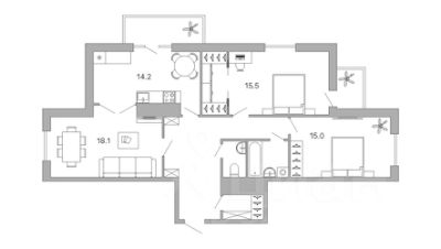 — Три изолированные комнаты (15 м2, 15,5 м2 и 16,5 м2): можно сделать спальни, детскую, рабочий кабинет