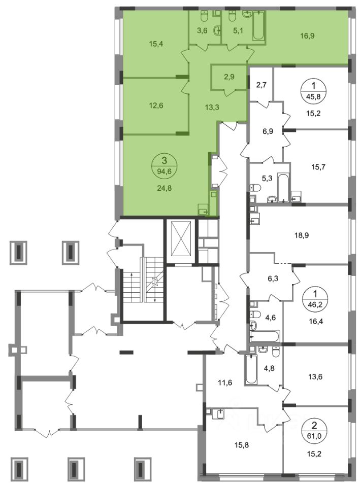Общая площадь квартиры - 94,6 кв. м, этаж 1 из 17.