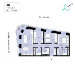 В продаже — трехкомнатная квартира с чистовой отделкой, общей площадью 119,51 кв. м. Квартира расположена на шестом этаже тринадцатиэтажной секции корпуса класса Адвансд в новом районе СберСити, который строит Сбер. Дом находится на второй береговой линии Москвы-реки.