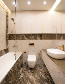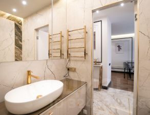 Санузел отделан итальянским керамогранитом, оснащен современной сантехникой.