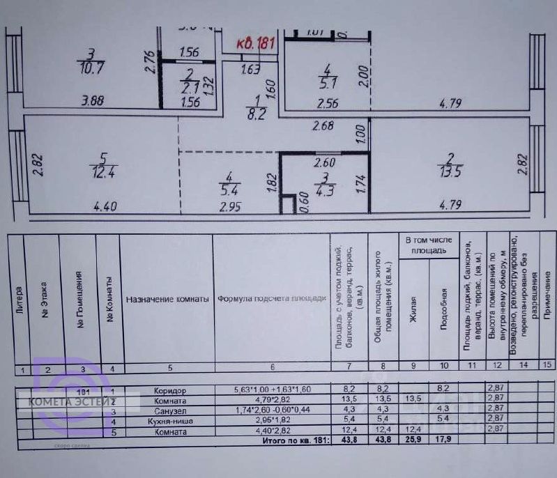 Общая площадь — 43,8 кв. м, жилая площадь — 26 кв. м, кухня — 12 кв. м.