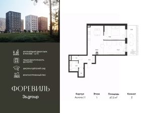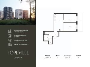 Продается уютная 2-комн. квартира площадью 67,3 кв.м на 1 этаже 17 этажного жилого комплекса бизнес-класса Foreville от 3S Group.
